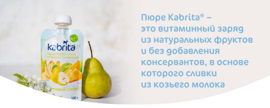 Пюре Kabrita® – это витаминный заряд из натуральных фруктов и без добавления консервантов, в основе которого сливки из козьего молока.
